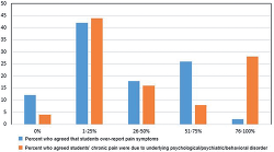 Additionally, our findings suggest that the majority of our sample of school nurses (88%) believed that some percentage of students with chronic pain overreport their pain symptoms. Moreover, 96% of school nurses endorsed that pain symptoms were due to an underlying psychological, psychiatric, or behavioral disorder. More detailed information about school nurse chronic pain attitude data is shown in Figure 1.
