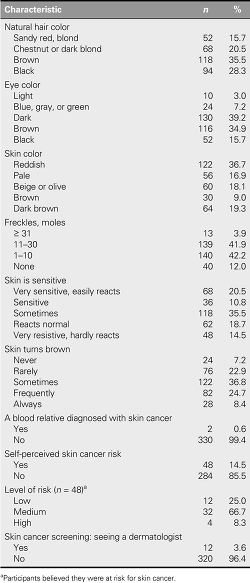 The participants were 18-23 years old; 67.5% were female (n = 224), and 32.5% were male (n = 108). In terms of descriptive characteristics, 15.7% had sandy red/blond hair; 10.2% had blue, gray, or light-colored eyes; 36.7% had fair skin; and 42.2% had 1-10 moles. Responses regarding skin cancer family history, screening, and perceived risk indicated that 0.6% of the participants had a blood relative who had been diagnosed with skin cancer, 3.6% of the participants had received physical checkups for skin cancer screening, and 14.5% of the participants believed that they were at risk for skin cancer. Furthermore, 25.0%, 66.7%, and 8.3% of the participants were at low, medium, and high risk, respectively. The descriptive characteristics of the participants are presented in Table 1. The skewness and kurtosis values, which indicate the normal distribution suitability of the data, were between +/- 2 and symmetry.