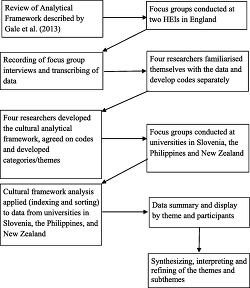 The development and preliminary testing of the cultural analytical framework encompassed a review of the framework method of analysis of qualitative research described by Gale et al. (2013) and Spencer, Ritchie, Ormston, O'Connor, and Barnard (2014; Figure 1). The focus groups were then facilitated and audio recorded at two HEIs in England. Focus groups were transcribed and analyzed separately by four researchers using framework analysis (Gale et al., 2013; Parveen, Peltier, & Oyebode, 2017; Robertshaw & Cross, 2017). To ensure transparency and reflexivity, all of the stages (Gale et al., 2013; Spencer et al., 2014) were carefully followed by the researchers.