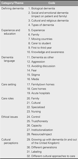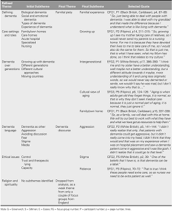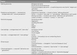 In Table 1, the first conceptual analytical framework, a table of themes and codes, shows 32 codes ranging from biological dementia to aggression, family/own homes, capacity, and different cultural approaches to care. The first column of the framework enabled the categorization of the codes into themes. Thus, seven categories are shown.