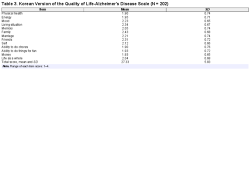 QoL was assessed using the Korean version of the Quality of Life-Alzheimer's Disease (KQoL-AD; Shin, 2006). The KQoL-AD was modified to fit the QoL-AD developed by Logsdon et al. (1999), which consists of 13 items rated on a 4-point Likert scale, ranging from 1 (bad) to 4 (very good). Total possible scores ranged from 13 to 52, with lower scores indicating worse QoL. Scale items address issues such as physical health, family, and ability to do things for fun. KQoL-AD is a tool for evaluating QoL in patients with dementia that has excellent content validity and test-retest reliability. As KQoL-AD is not affected by cognitive function or the dementia stage, this scale has been used on patients with non-dementia-related cognitive impairments as well as on patients with dementia (H. J. Kim et al., 2008). KQoL-AD may be used to evaluate the QoL in patients using self-reported data as well as using responses provided by caregivers. In this study, those participants who expressed experiencing difficulties in filling out this scale were permitted to have their legal agents complete the scale on their behalf. The Cronbach's [alpha] of the KQoL-AD was .88 in the study of Shin and was .88 in this study.