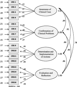 In this study, the four-domain, 12-indicator, 16-item CRS instrument was developed to assess nursing students' CR competency. The CR instruments in the literature differ widely to address a diverse range of purposes. Because of the unique scope of the nursing profession, only nursing CR instruments were included in this discussion. Among the nursing CR assessment tools currently available, the LCJR is a frequently used instrument in nursing education, particularly for student simulation experiences. There are similarities and differences between the LCJR and the CRS. The four domains of the CRS are similar to the components of the LCJR (noticing, interpreting, responding, and reflecting; Lasater, 2007). However, the indicators used in the two instruments are different. The 11 indicators of the LCJR were derived from observations of students' simulation experiences (Lasater, 2007), whereas the 12 indicators of the CRS were developed inductively using a qualitative study involving clinically and academically experienced nursing educators and validated for goodness of fit with the theoretical model using CFA. One of the challenges of employing the LCJR is the need for extensive training (K. Adamson, 2016; Victor-Chmil & Larew, 2013). The LCJR consists of four domains, 11 indicators, and four developmental phases (exemplary, accomplished, developing, and beginning), which generate data in 44 columns describing each indicator at different developmental phases. Most of the descriptions for each column include more than one behavioral manifestation of the indicator, which may contribute to difficulties in selecting the appropriate column representing students' CR abilities. Compared with the LCJR, the CRS is clear and succinct and has been validated by CFA. Faculty and students may complete this instrument in 5-10 minutes, with the results immediately applicable to identifying areas of improvement in CR in all nursing courses, especially practicums.